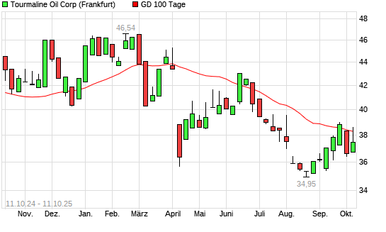 Mit dem Rücksetzer auf 37,44 EUR hat die Tourmaline Oil-Aktie am 10.10.2025 die 100-Tage-Linie nach unten gekreuzt.