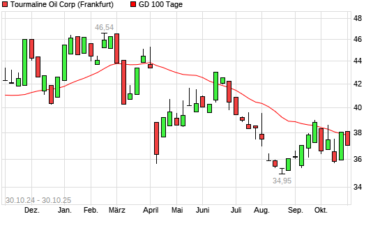 Mit dem Rücksetzer auf 37,59 EUR hat die Tourmaline Oil-Aktie am 29.10.2025 die 100-Tage-Linie nach unten gekreuzt.