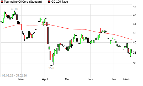 Mit dem Rücksetzer auf 37,53 EUR hat die Tourmaline Oil-Aktie am 04.02.2026 die 100-Tage-Linie nach unten gekreuzt.