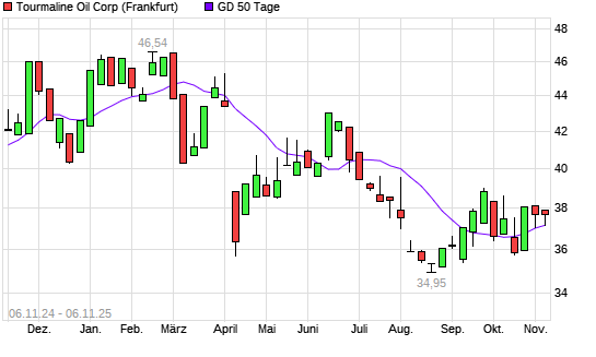 Mit dem Rücksetzer auf 37,11 EUR hat die Tourmaline Oil-Aktie am 05.11.2025 die 50-Tage-Linie nach unten gekreuzt.