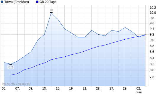 Mit dem Rücksetzer auf 9,10 EUR hat die Towa-Aktie am 02.06.2025 die 20-Tage-Linie nach unten gekreuzt.