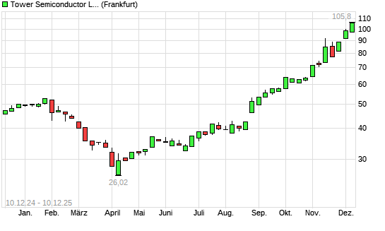 Mit dem Anstieg auf 101,40 EUR hat die Tower Semiconductor-Aktie (ISIN IL0010823792) am 09.12.2025 ein neues All-Time-High erreicht und damit den Kurs vom 03.12.2025 eingestellt.