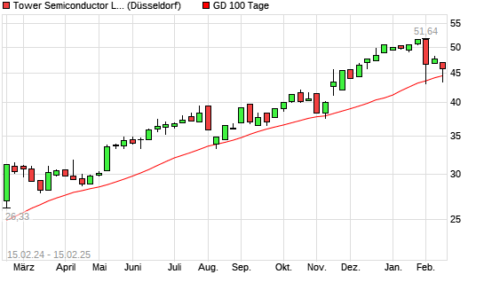 Mit dem Anstieg auf 45,44 EUR hat die Tower Semiconductor-Aktie am 14.02.2025 die 100-Tage-Linie nach oben gekreuzt.