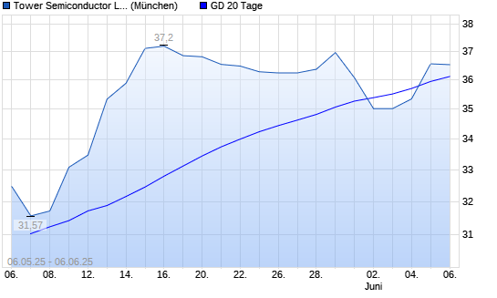 Mit dem Anstieg auf 36,34 EUR hat die Tower Semiconductor-Aktie am 05.06.2025 die 20-Tage-Linie nach oben gekreuzt.