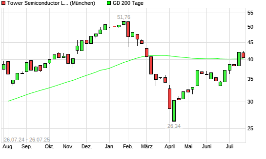 Mit dem Rücksetzer auf 39,61 EUR hat die Tower Semiconductor-Aktie am 25.07.2025 die 200-Tage-Linie nach unten gekreuzt.