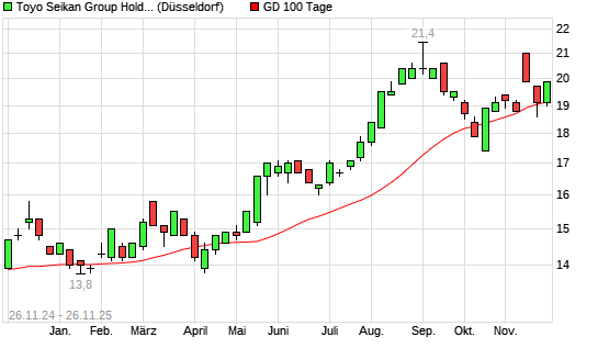Mit dem Anstieg auf 19,60 EUR hat die Toyo Seikan Kaisha-Aktie am 25.11.2025 die 100-Tage-Linie nach oben gekreuzt.