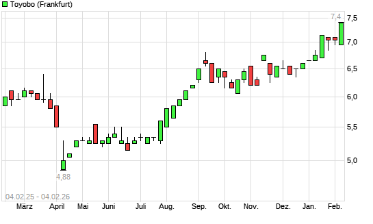 Mit dem Anstieg auf 7,20 EUR hat die Toyobo-Aktie (ISIN JP3619800000) am 03.02.2026 ein neues 12-Monats-Hoch erreicht und damit den Kurs vom 16.01.2026 eingestellt.
