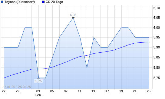 Mit dem Anstieg auf 6,00 EUR hat die Toyobo-Aktie am 24.02.2025 die 20-Tage-Linie nach oben gekreuzt.
