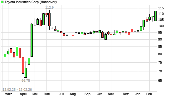 Mit dem Anstieg auf 108,20 EUR hat die Toyoda Automatic Loom Works-Aktie (ISIN JP3634600005) am 12.02.2026 ein neues 6-Monats-Hoch erreicht und damit den Kurs vom 09.02.2026 eingestellt.