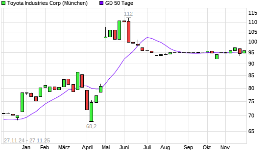 Mit dem Anstieg auf 95,15 EUR hat die Toyoda Automatic Loom Works-Aktie am 26.11.2025 die 50-Tage-Linie nach oben gekreuzt.