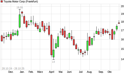 Mit dem Anstieg auf 17,89 EUR hat die Toyota Motor-Aktie (ISIN JP3633400001) am 27.10.2025 ein neues 6-Monats-Hoch erreicht und damit den Kurs vom 23.10.2025 eingestellt.