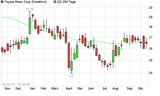 Mit dem Anstieg auf 16,79 EUR hat die Toyota Motor-Aktie am 15.10.2025 die 200-Tage-Linie nach oben gekreuzt.