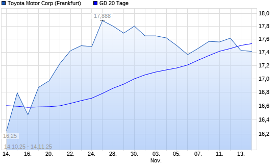 Mit dem Rücksetzer auf 17,43 EUR hat die Toyota Motor-Aktie am 13.11.2025 die 20-Tage-Linie nach unten gekreuzt.