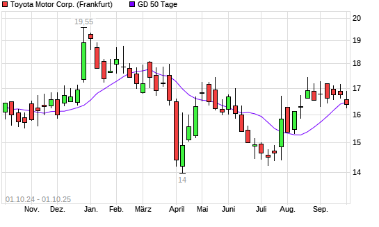Mit dem Rücksetzer auf 16,27 EUR hat die Toyota Motor-Aktie am 30.09.2025 die 50-Tage-Linie nach unten gekreuzt.