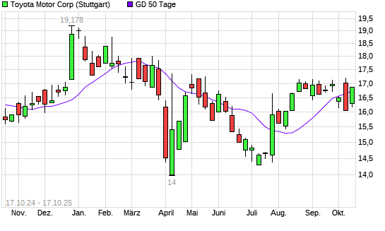 Mit dem Rücksetzer auf 16,47 EUR hat die Toyota Motor-Aktie am 16.10.2025 die 50-Tage-Linie nach unten gekreuzt.