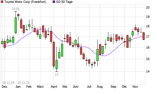 Mit dem Rücksetzer auf 17,00 EUR hat die Toyota Motor-Aktie am 17.11.2025 die 50-Tage-Linie nach unten gekreuzt.