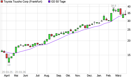Mit dem Rücksetzer auf 33,60 EUR hat die Toyota Tsusho-Aktie am 19.03.2026 die 50-Tage-Linie nach unten gekreuzt.