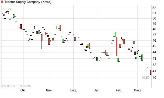Mit dem Rücksetzer auf 40,62 EUR hat die Tractor Supply Company-Aktie (ISIN US8923561067) am 18.03.2026 ein neues 12-Monats-Tief erreicht und damit den Kurs vom 16.03.2026 eingestellt.