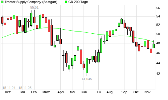 Mit dem Rücksetzer auf 47,30 EUR hat die Tractor Supply Company-Aktie am 14.11.2025 die 200-Tage-Linie nach unten gekreuzt.