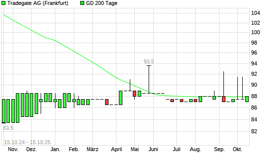 Mit dem Anstieg auf 88,00 EUR hat die Tradegate-Aktie am 14.10.2025 die 200-Tage-Linie nach oben gekreuzt.