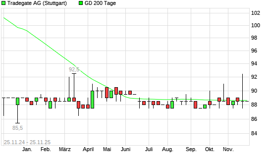 Mit dem Rücksetzer auf 87,50 EUR hat die Tradegate-Aktie am 24.11.2025 die 200-Tage-Linie nach unten gekreuzt.