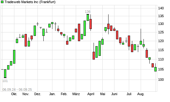Mit dem Rücksetzer auf 101,00 EUR hat die Tradeweb Markets-Aktie (ISIN US8926721064) am 05.09.2025 ein neues 6-Monats-Tief erreicht und damit den Kurs vom 29.08.2025 eingestellt.