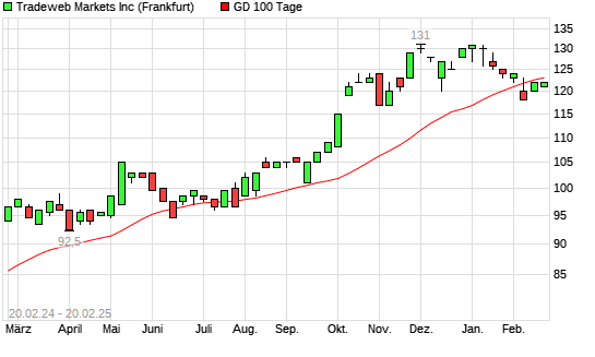 Mit dem Anstieg auf 124,00 EUR hat die Tradeweb Markets-Aktie am 19.02.2025 die 100-Tage-Linie nach oben gekreuzt.