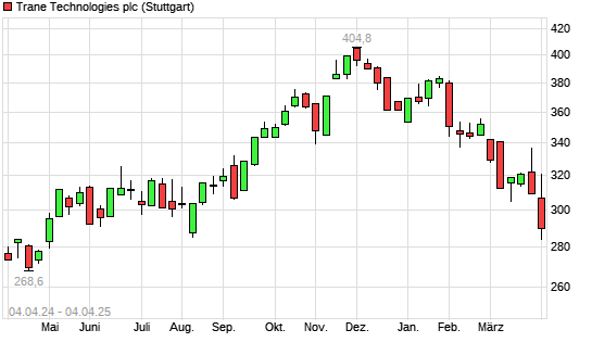 Mit dem Rücksetzer auf 298,60 EUR hat die Trane Technologies-Aktie (ISIN IE00BK9ZQ967) am 03.04.2025 ein neues 6-Monats-Tief erreicht und damit den Kurs vom 11.03.2025 eingestellt.