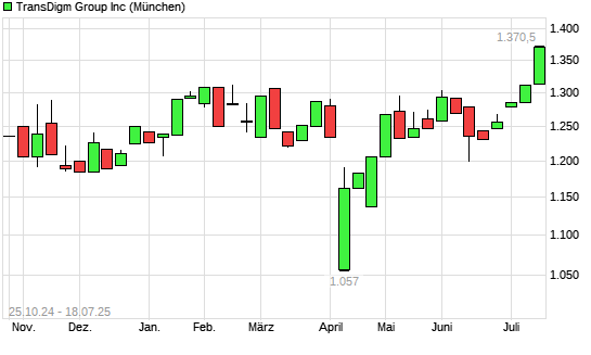 Mit dem Anstieg auf 1.365,50 EUR hat die TransDigm Group-Aktie (ISIN US8936411003) am 17.07.2025 ein neues All-Time-High erreicht und damit den Kurs vom 16.07.2025 eingestellt.