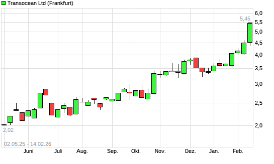 Mit dem Anstieg auf 5,45 EUR hat die Transocean-Aktie (ISIN CH0048265513) am 13.02.2026 ein neues 12-Monats-Hoch erreicht und damit den Kurs vom 12.02.2026 eingestellt.
