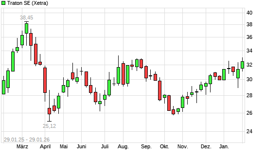Mit dem Anstieg auf 32,52 EUR hat die Traton-Aktie (ISIN DE000TRAT0N7) am 28.01.2026 ein neues 6-Monats-Hoch erreicht und damit den Kurs vom 07.01.2026 eingestellt.