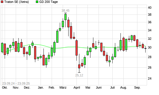 Mit dem Rücksetzer auf 28,96 EUR hat die Traton-Aktie am 22.09.2025 die 200-Tage-Linie nach unten gekreuzt.