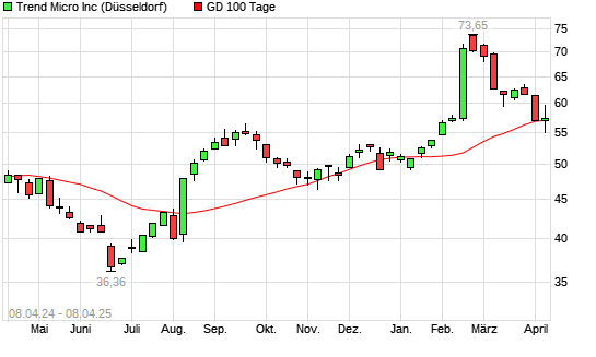 Mit dem Rücksetzer auf 55,25 EUR hat die Trend Micro-Aktie am 07.04.2025 die 100-Tage-Linie nach unten gekreuzt.