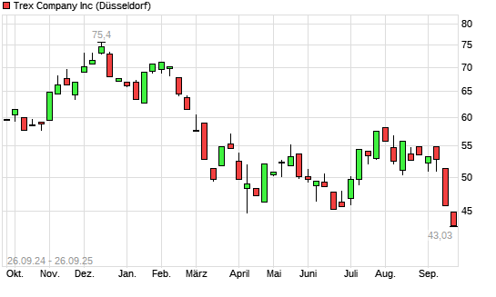 Mit dem Rücksetzer auf 42,58 EUR hat die Trex-Aktie (ISIN US89531P1057) am 25.09.2025 ein neues 12-Monats-Tief erreicht und damit den Kurs vom 23.09.2025 eingestellt.