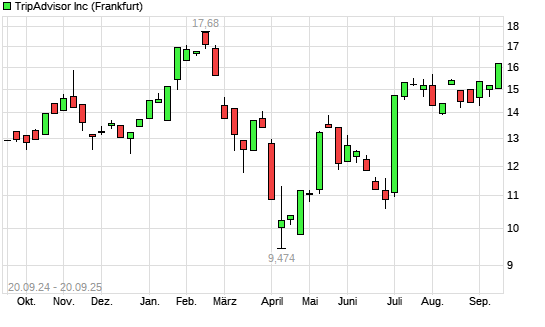Mit dem Anstieg auf 16,15 EUR hat die TripAdvisor-Aktie (ISIN US8969452015) am 19.09.2025 ein neues 6-Monats-Hoch erreicht und damit den Kurs vom 16.09.2025 eingestellt.
