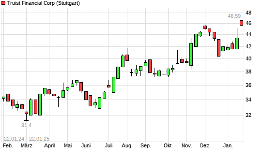 Mit dem Anstieg auf 46,40 EUR hat die Truist Financial-Aktie (ISIN US89832Q1094) am 21.01.2025 ein neues 12-Monats-Hoch erreicht und damit den Kurs vom 20.01.2025 eingestellt.