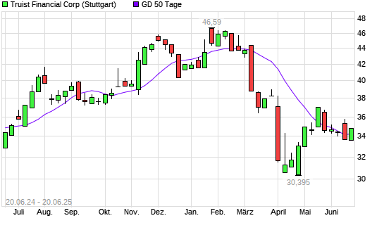 Mit dem Anstieg auf 34,41 EUR hat die Truist Financial-Aktie am 19.06.2025 die 50-Tage-Linie nach oben gekreuzt.