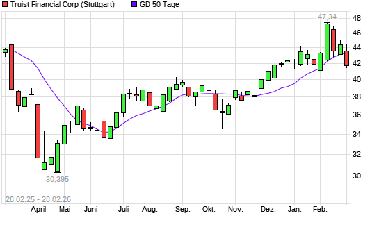 Mit dem Anstieg auf 43,20 EUR hat die Truist Financial-Aktie am 27.02.2026 die 50-Tage-Linie nach oben gekreuzt.