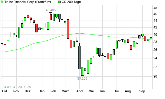 Mit dem Rücksetzer auf 38,11 EUR hat die Truist Financial-Aktie am 23.09.2025 die 200-Tage-Linie nach unten gekreuzt.