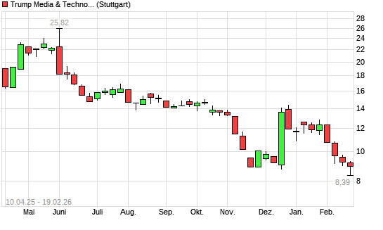 Mit dem Rücksetzer auf 8,24 EUR hat die Trump Media & Technology Group Corp-Aktie (ISIN US25400Q1058) am 18.02.2026 ein neues All-Time-Low erreicht und damit den Kurs vom 16.12.2025 eingestellt.