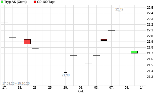 Mit dem Rücksetzer auf 21,54 EUR hat die Tryg A/S-Aktie am 14.10.2025 die 100-Tage-Linie nach unten gekreuzt.