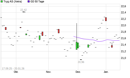 Mit dem Rücksetzer auf 21,28 EUR hat die Tryg A/S-Aktie am 19.01.2026 die 50-Tage-Linie nach unten gekreuzt.