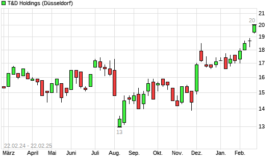 Mit dem Anstieg auf 20,20 EUR hat die T&D Holdings-Aktie (ISIN JP3539220008) am 21.02.2025 ein neues 10-Jahres-Hoch erreicht und damit den Kurs vom 20.02.2025 eingestellt.