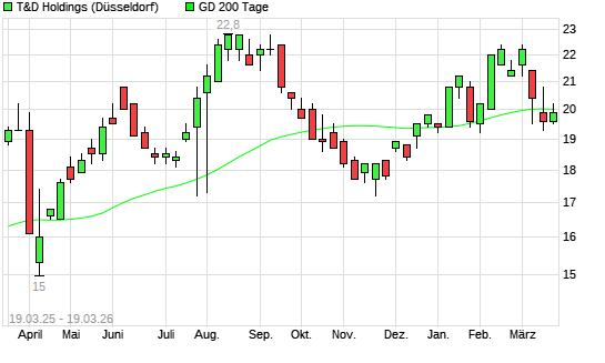 Mit dem Rücksetzer auf 19,70 EUR hat die T&D Holdings-Aktie am 18.03.2026 die 200-Tage-Linie nach unten gekreuzt.