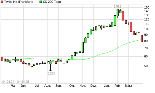Mit dem Rücksetzer auf 81,77 EUR hat die Twilio-Aktie am 03.04.2025 die 200-Tage-Linie nach unten gekreuzt.
