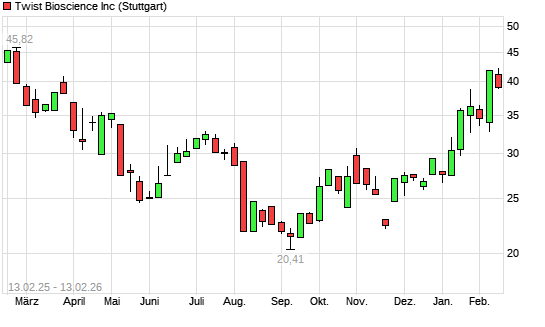 Mit dem Anstieg auf 41,52 EUR hat die Twist Bioscience-Aktie (ISIN US90184D1000) am 12.02.2026 ein neues 6-Monats-Hoch erreicht und damit den Kurs vom 09.02.2026 eingestellt.