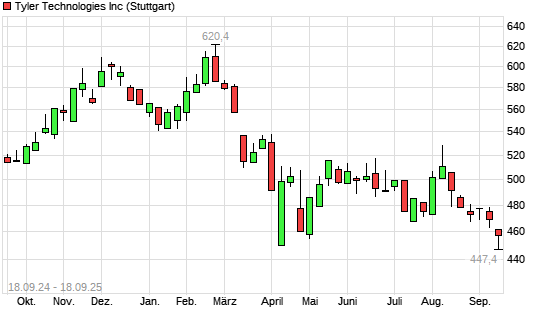 Mit dem Rücksetzer auf 448,80 EUR hat die Tyler Techs-Aktie (ISIN US9022521051) am 17.09.2025 ein neues 12-Monats-Tief erreicht und damit den Kurs vom 16.09.2025 eingestellt.