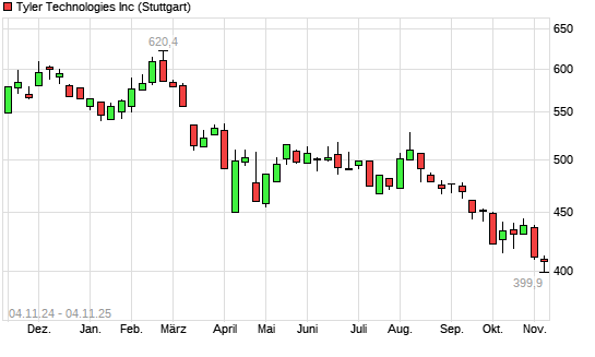 Mit dem Rücksetzer auf 403,10 EUR hat die Tyler Techs-Aktie (ISIN US9022521051) am 03.11.2025 ein neues 12-Monats-Tief erreicht und damit den Kurs vom 29.10.2025 eingestellt.