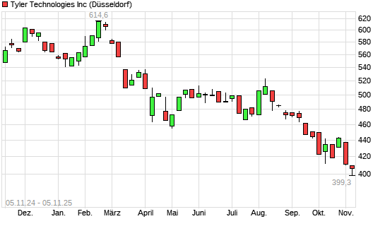 Mit dem Rücksetzer auf 399,60 EUR hat die Tyler Techs-Aktie (ISIN US9022521051) am 04.11.2025 ein neues 12-Monats-Tief erreicht und damit den Kurs vom 03.11.2025 eingestellt.