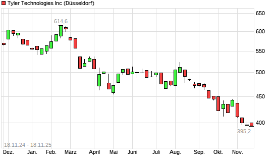Mit dem Rücksetzer auf 399,00 EUR hat die Tyler Techs-Aktie (ISIN US9022521051) am 17.11.2025 ein neues 12-Monats-Tief erreicht und damit den Kurs vom 13.11.2025 eingestellt.
